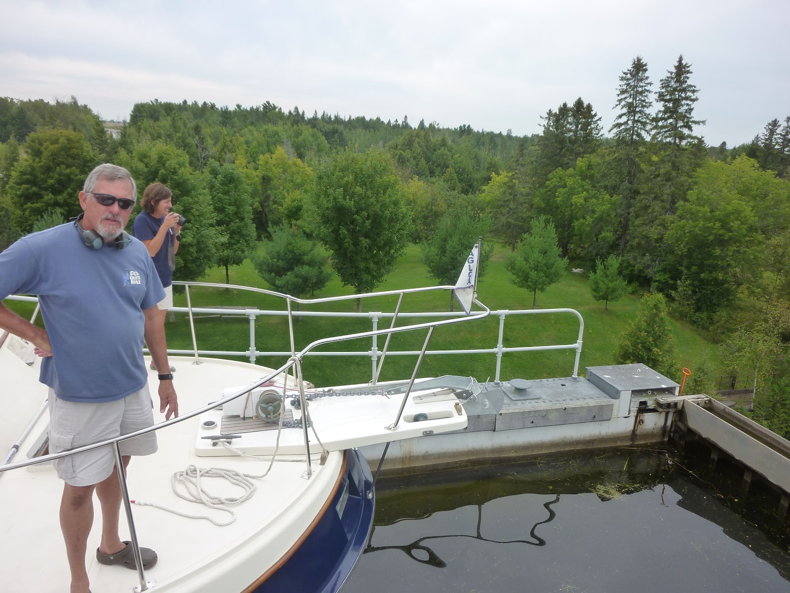We had a couple of additional momentous lock experiences. Kirkfield Lock was similar to Peterborough, except much more intimidating! Unlike the other locks where there is a tall wall at the front of the lock, there is no such wall at Kirkfield. We drove the boat into a large metal tub filled with water and stopped short of what appeared to be a drop off the edge of the tub -- 49 feet down! It’s just your perception that you might fall off though, but it is daunting! Like Peterborough it works like a teeter-totter. The lock keeper fills the top tub with an extra foot of water, causing it to drop and the other lock tub to rise. It’s actually a very smooth ride down. Prior to Kirkfield we had been ascending up the Trent-Severn, but that now changed at Kirkfield as we began our descent to the Georgian Bay water level.